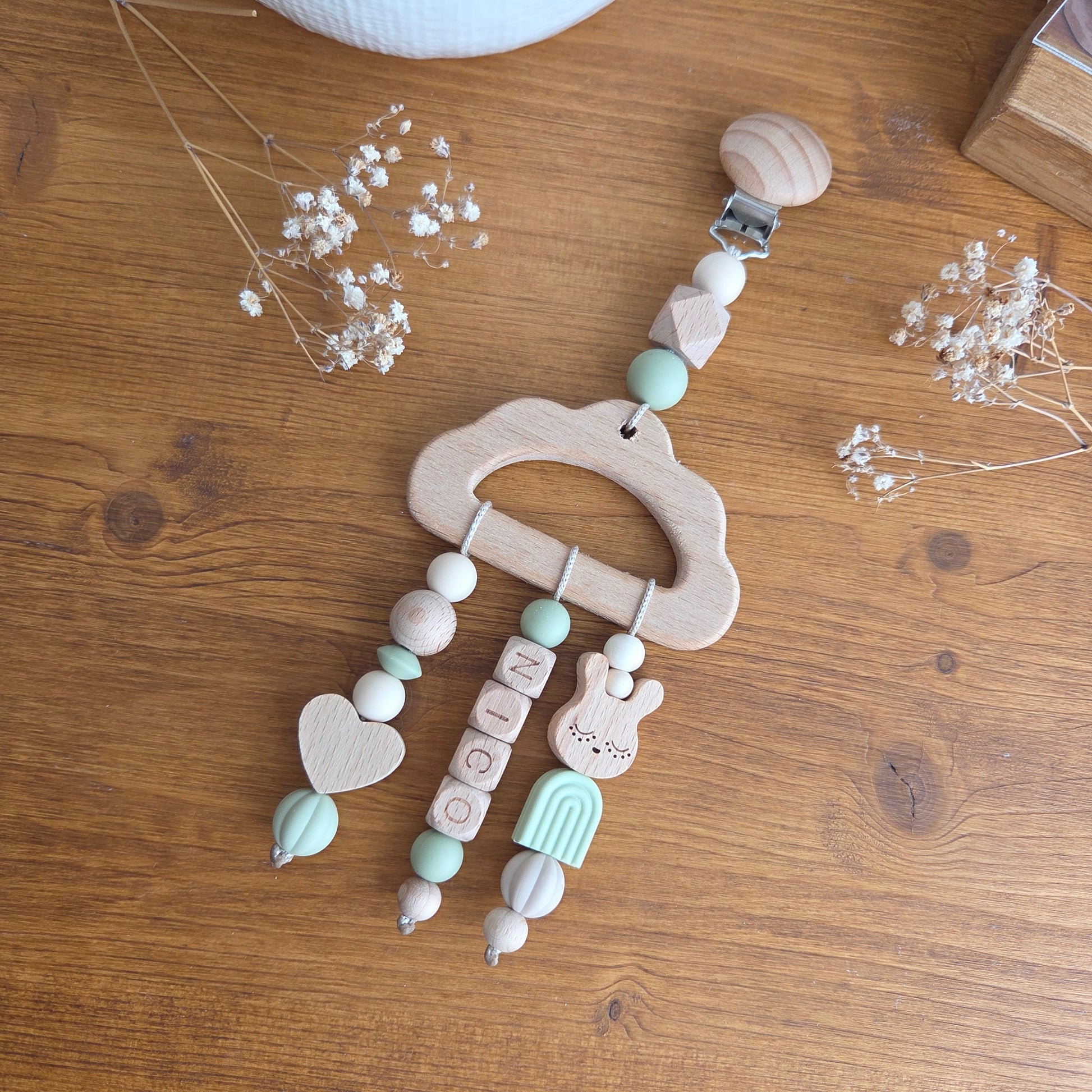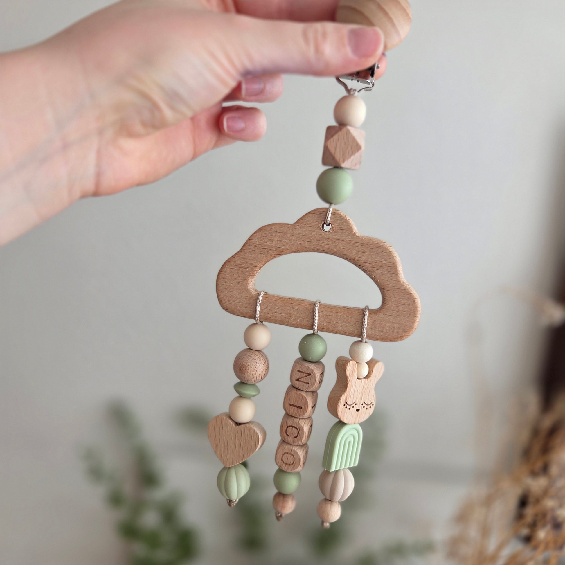 Dieser liebevoll handgefertigte Anhänger ist ein personalisierter Begleiter für Kinderwagen oder Babyschale und macht jeden Spaziergang ein Stück besonderer. Ob als zartes Geschenk zur Geburt oder als individuelles Accessoire für dein eigenes Baby – dieser Anhänger verbindet Natürlichkeit, Design und Persönlichkeit.