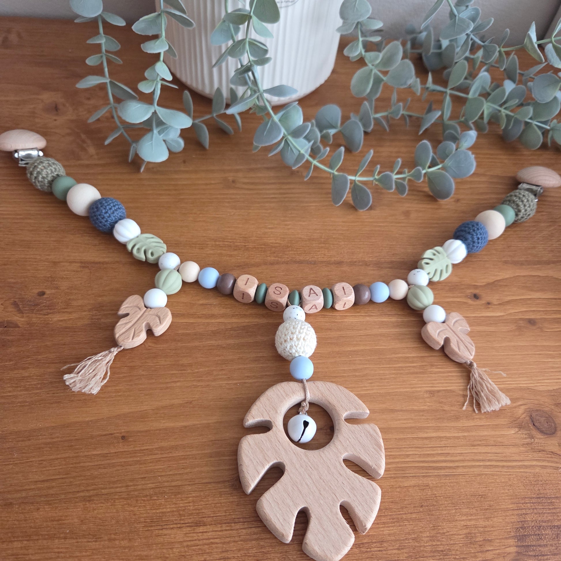 Diese Kinderwagenkette wird genau so gefertigt, wie du sie auf dem Bild siehst. Die harmonische Kombination aus Naturtönen, sanften Grün- und Blauschattierungen sowie hochwertigen Holz- und Silikonperlen verleiht ihr einen natürlichen, modernen Look. Besonders sticht das grosse Monstera-Holzblatt in der Mitte hervor, das der Kette einen einzigartigen, botanisch angehauchten Stil verleiht.